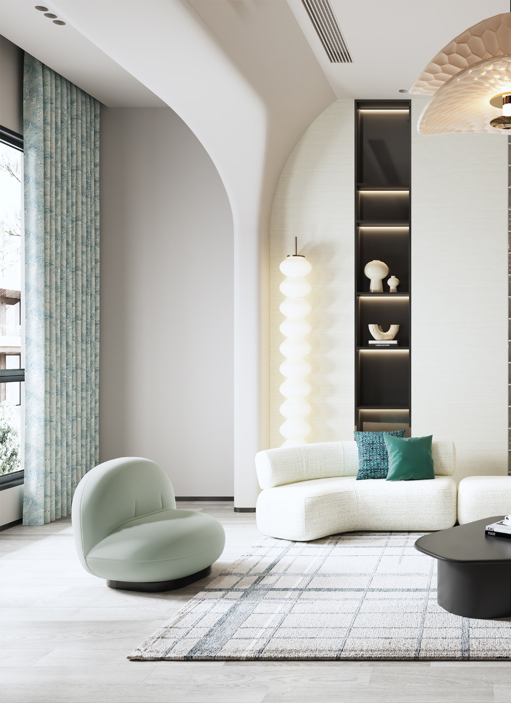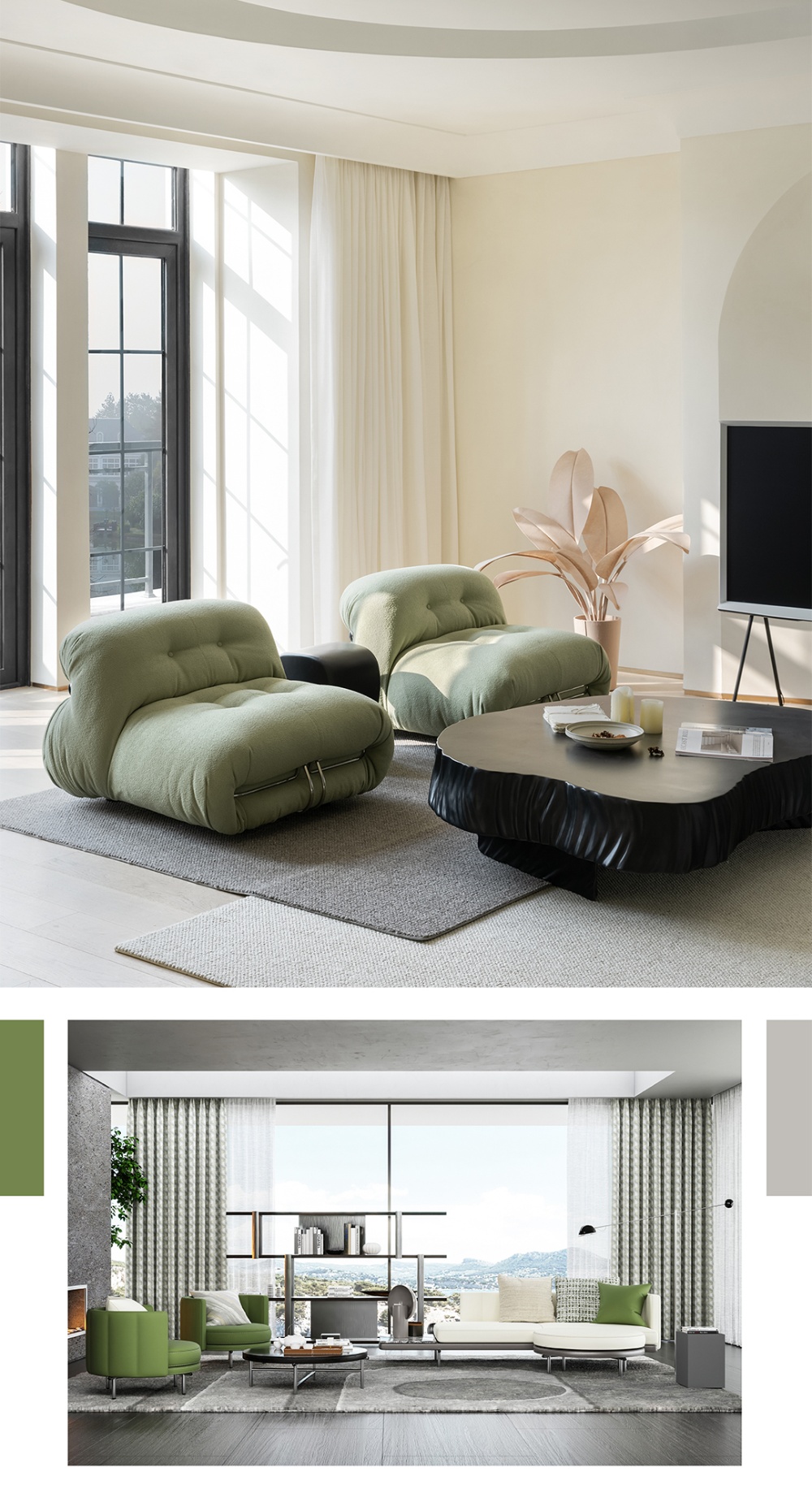 綠色在空間中不適合過大面積使用,適用于局部點綴,例如沙發(fā),茶幾,或者一面墻,窗簾,搭配米色/白色,給人安靜,清新,沉穩(wěn)的感覺。